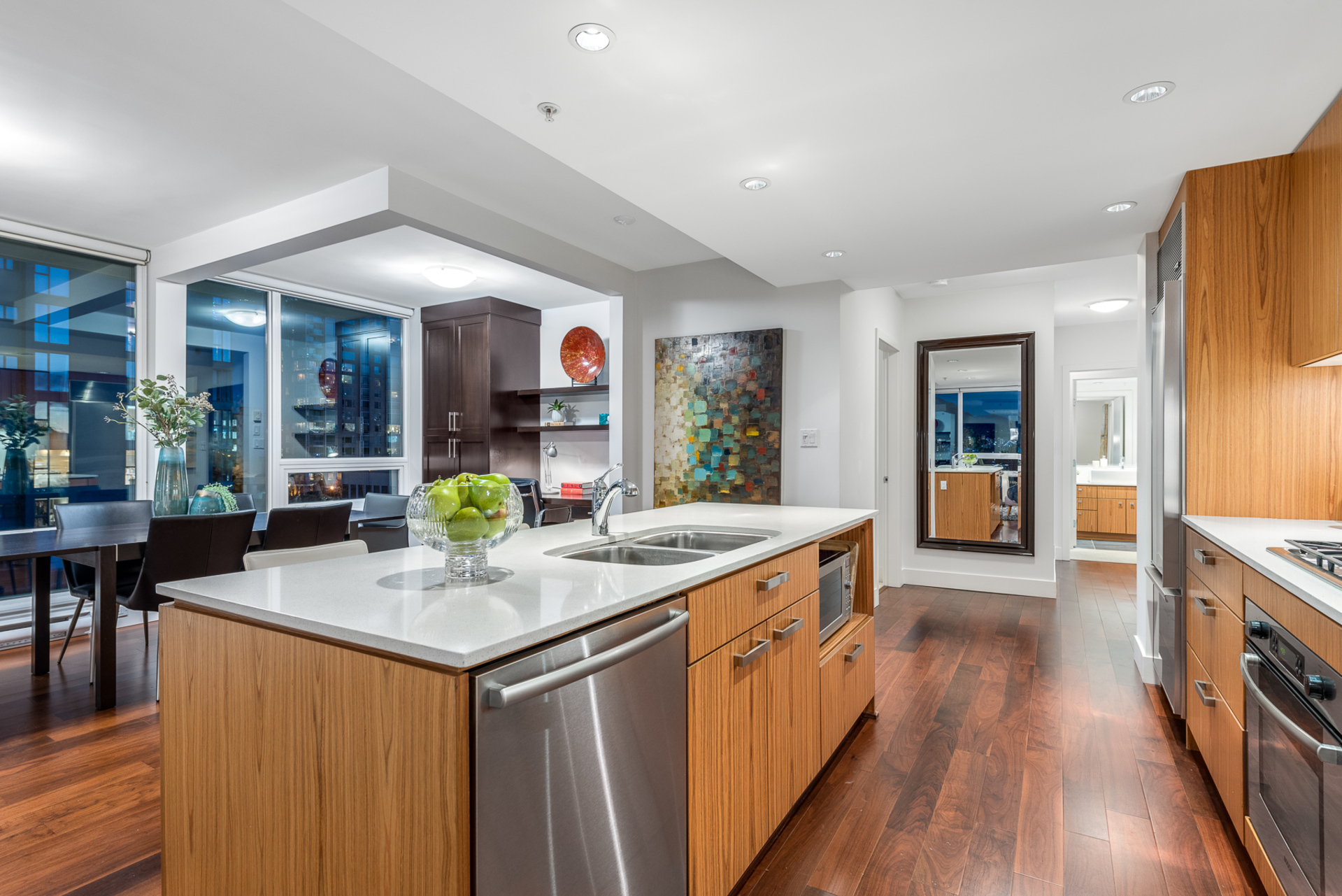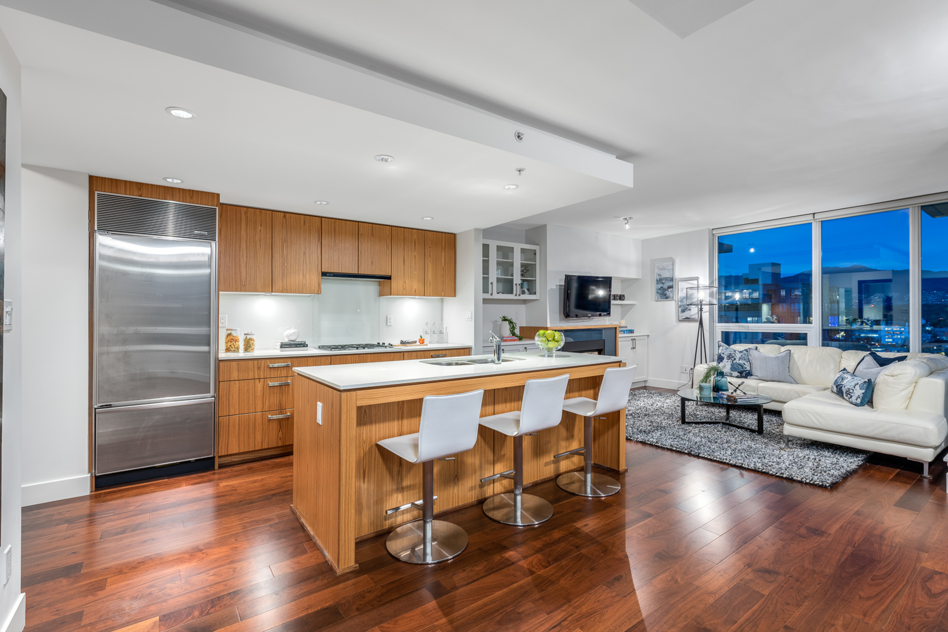 At 1,173 sq. ft this 2-bedroom, 2-bathroom plan reveals luxury details at every turn. Designed by Ramsey Worden and expertly built by Intracorp, the spacious, bright interior boasts en…gineered walnut hardwood floors, teak cabinetry and top of the line appliances from Sub-zero and Bosch. Stylish custom touches are sure to impress in an expanded dining room / kitchen entertainment zone. The second bedroom includes a unique hide-away built-in bed, offering maximum flexibility and use of space for office and overnight guests.