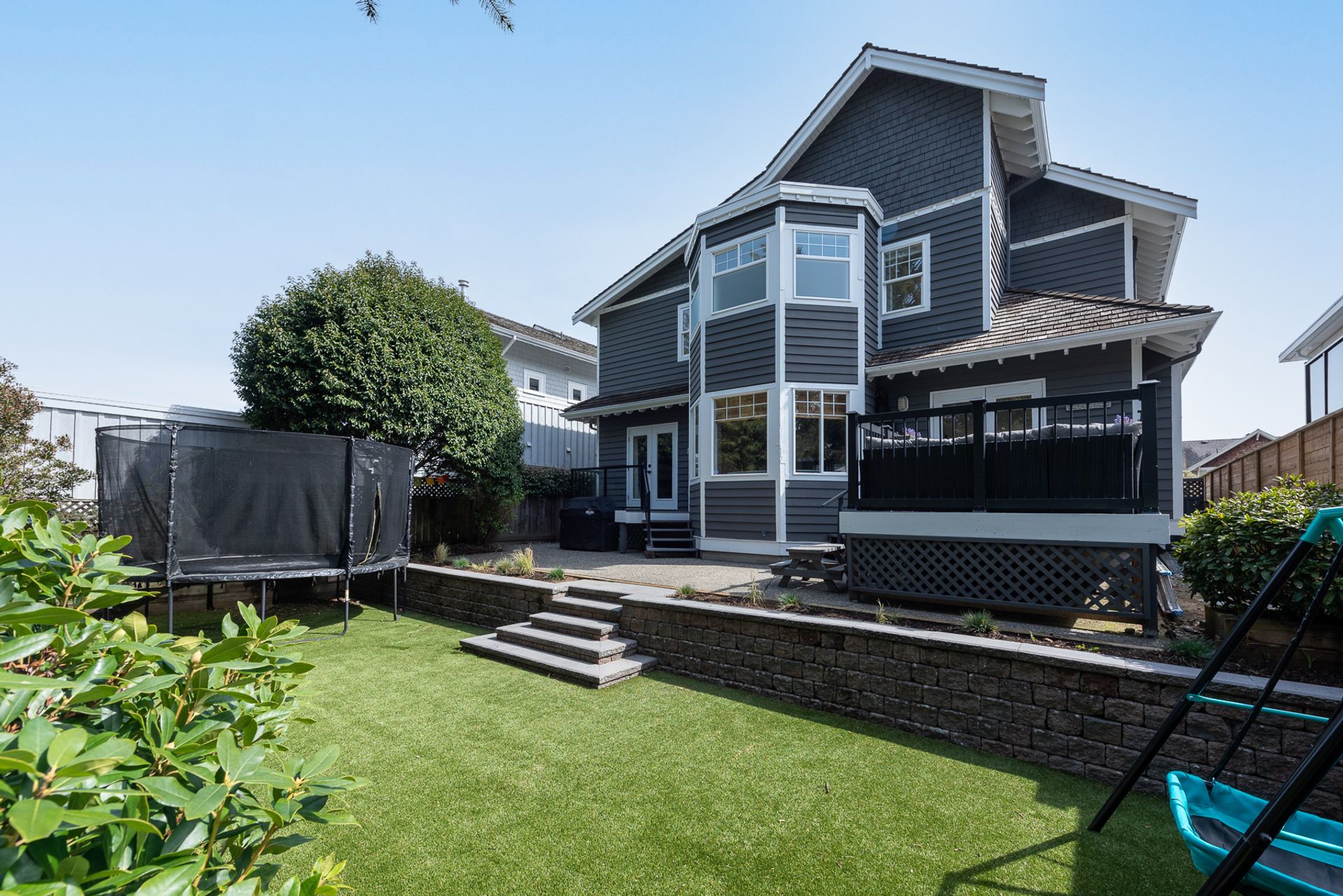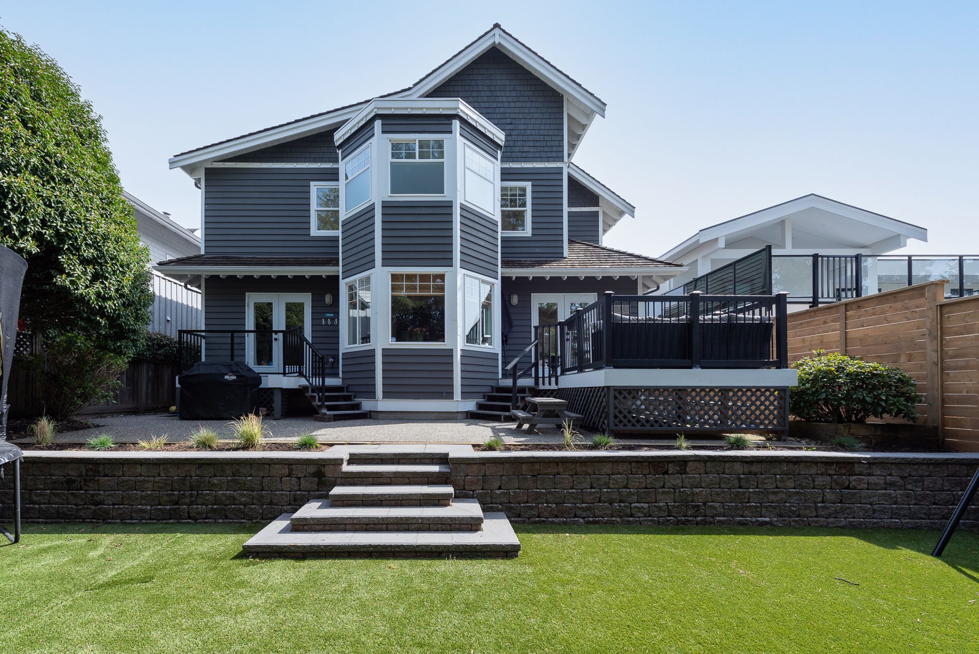 The heart of this 5 bedroom home is in the open kitchen and family living area, totally redesigned for comfortable, modern living. Stainless appliances, quartz counters, custom cabinets and engineered hardwood throughout the lower level. Custom built-in banquette seating allows plenty of room for family to gather. Double French doors lead from the breakfast bar peninsula to an entertainment-sized deck. A large, fenced yard with mature landscaping is perfect for west coast weekend get-togethers.
