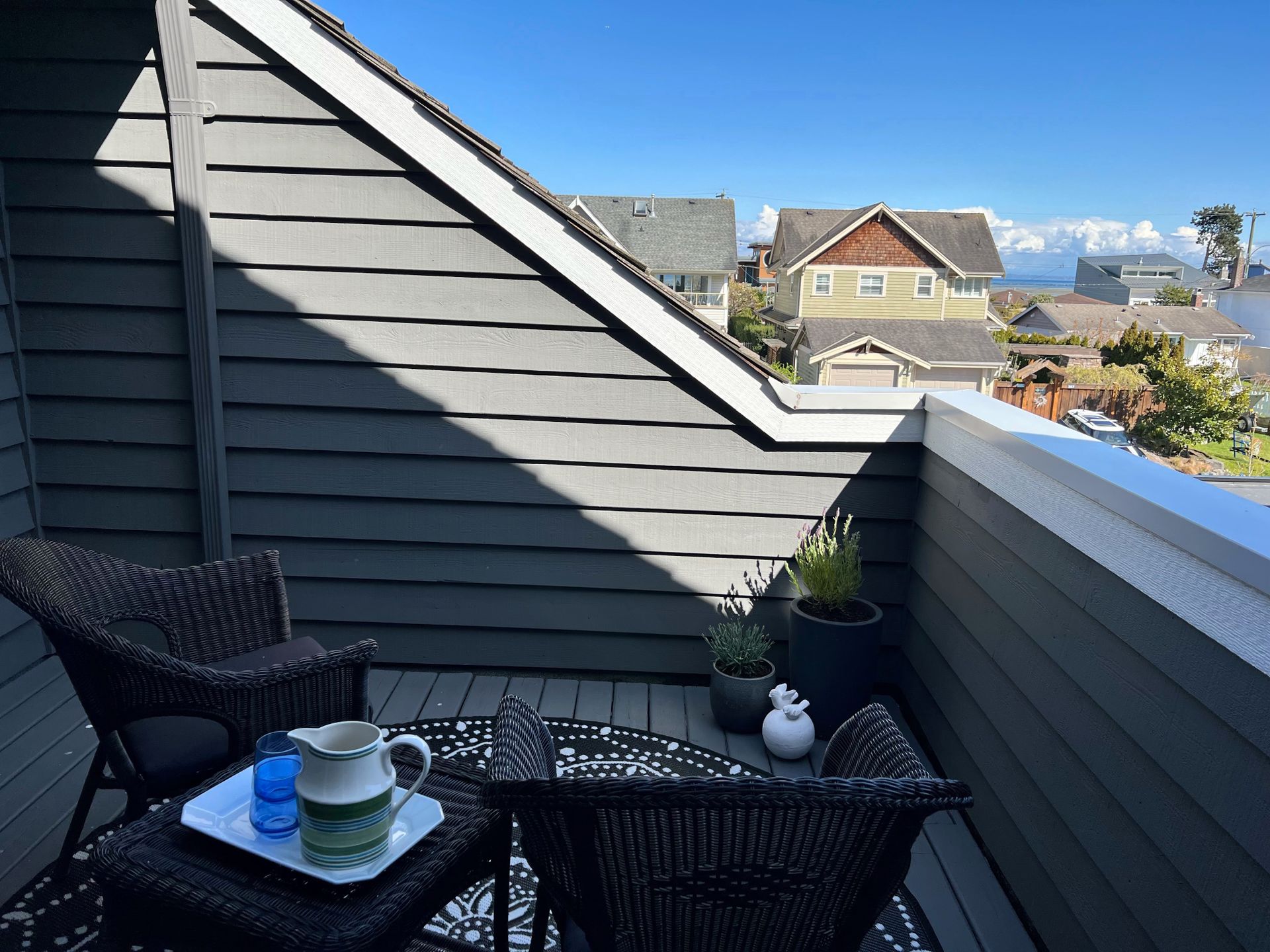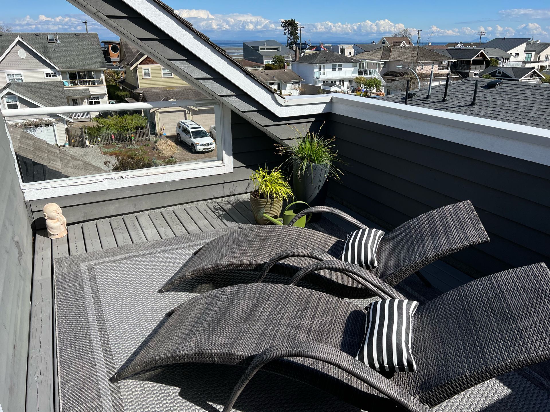 A cozy deck off the primary bedroom, and newly renovated spa bathroom provide an idyllic space to soak in the views and breathe in the sea air. Climb upward to the rooftop, where an indoor-outdoor deck awaits, with panoramic views of Boundary Bay and beyond. A perfect play space, or tranquil spot for yoga and meditation.